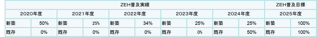 弊社としては下表の目標数値を掲げ快適な室内環境を保ちながら、住宅エネルギー量が正味(ネット)で概ねゼロ以下となる、ZEHの普及に努めて参ります。